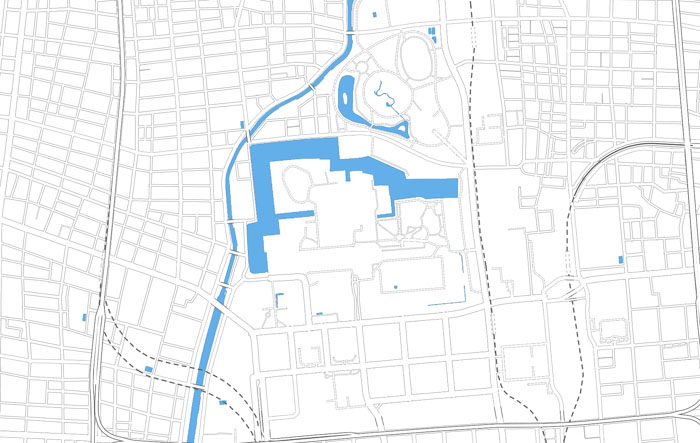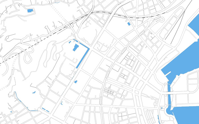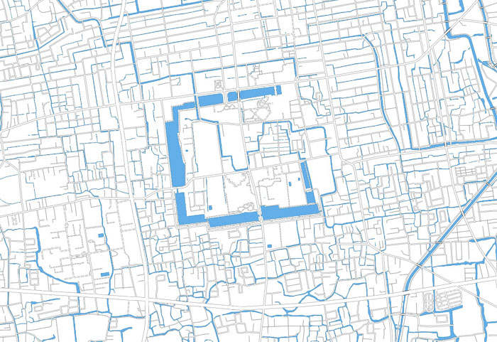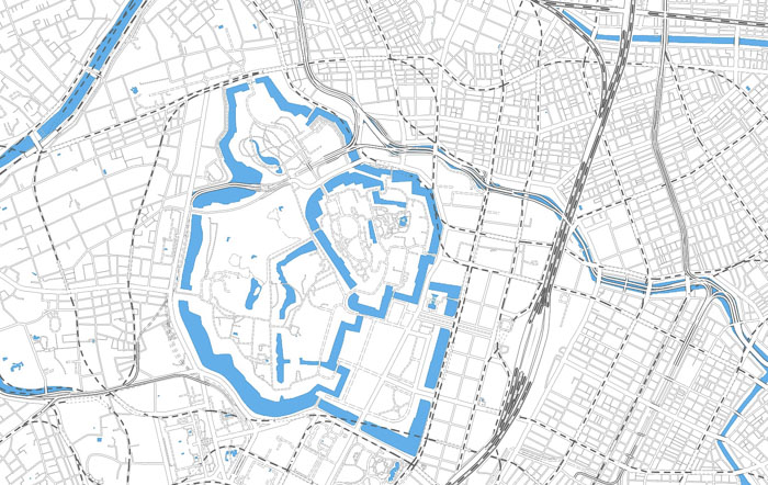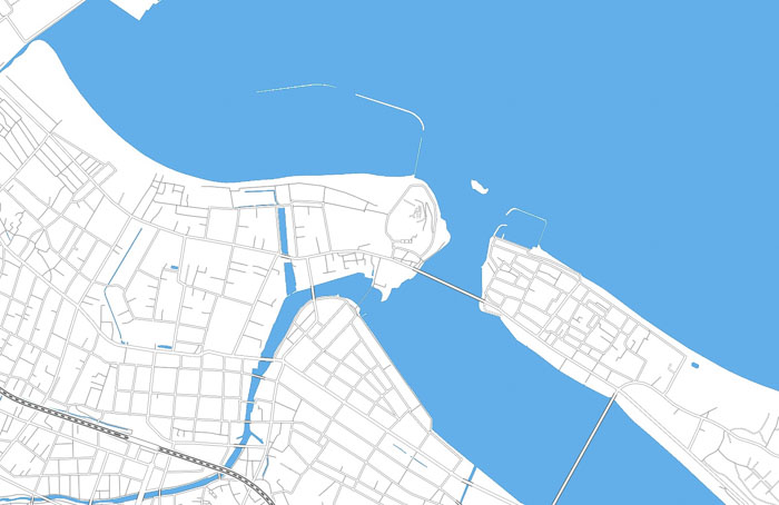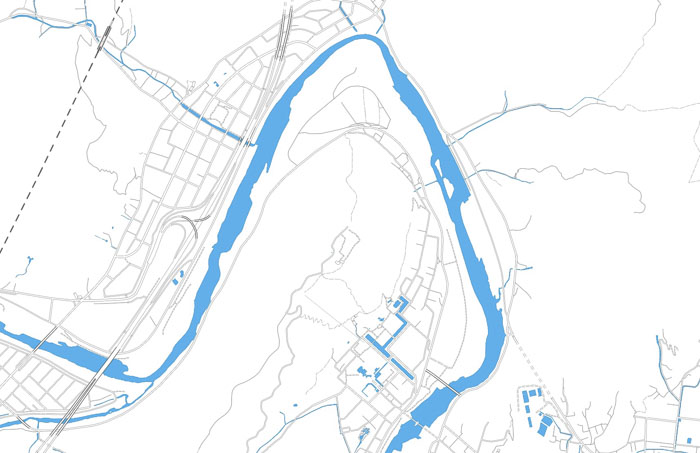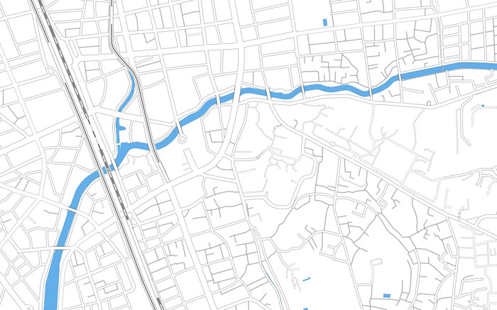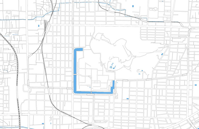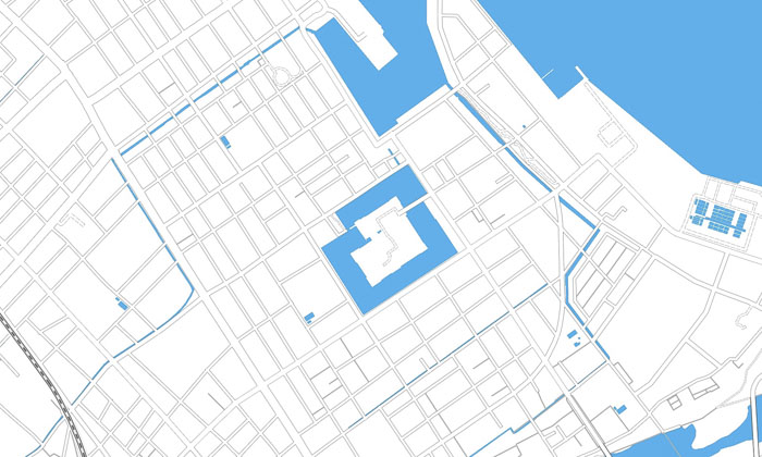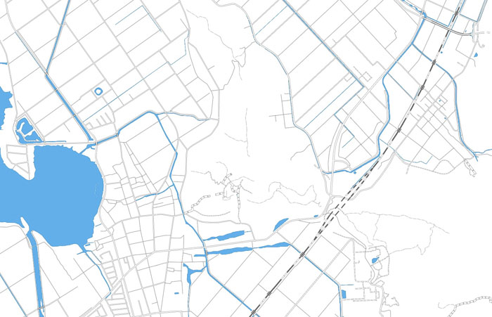 地図に「鉄道路線」「道路」と、海・川・湖・お濠などの「水域」だけが表示されています。