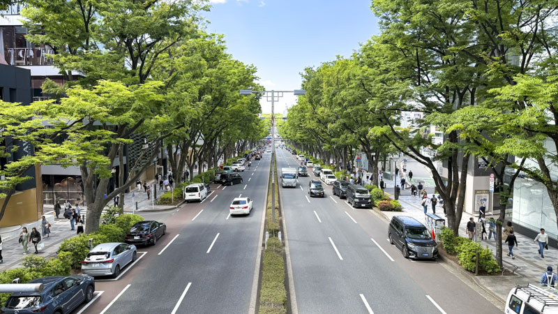 表参道(東京都渋谷区)の写真だね。港区と渋谷区の境界近くにある歩道橋(神宮前第2歩道橋)から撮ったよ。