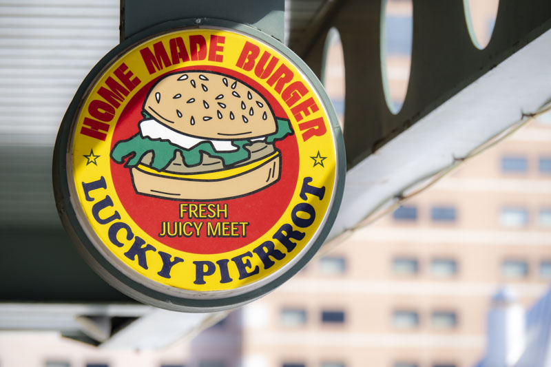 ラッキーピエロ(マリーナ末広店)の看板だよ。ラッキーピエロは函館を中心に展開するハンバーガーチェーン店だよ。ご当地チェーン店 大好き!
