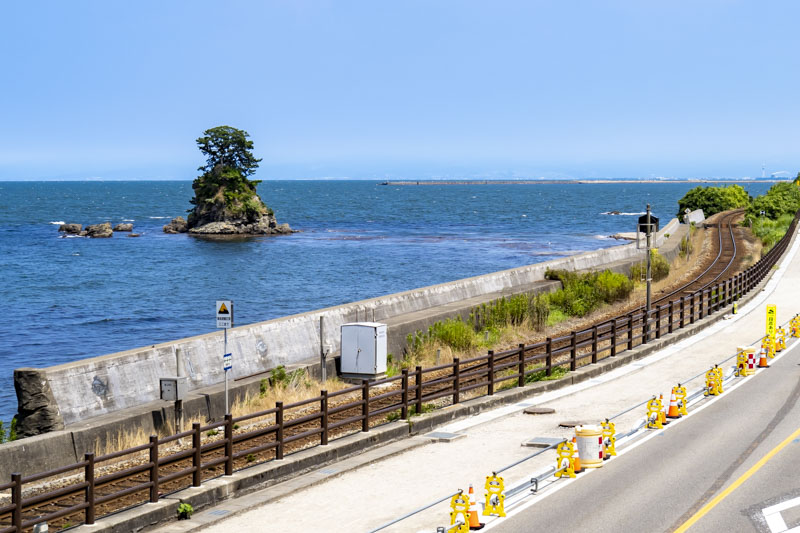 富山県高岡市の景勝地「雨晴海岸(あまはらしかいがん)」の写真だよ。