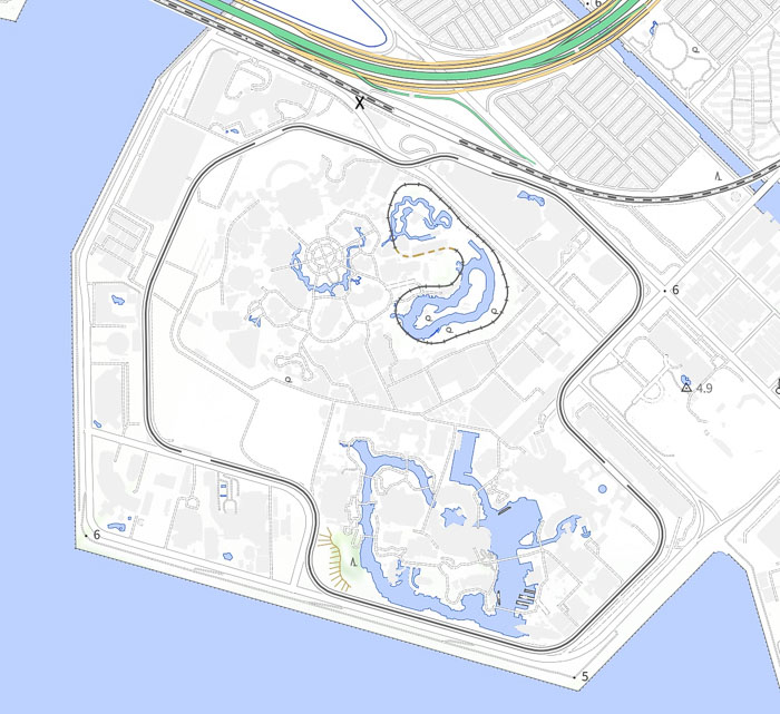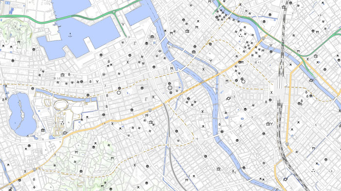 地図の左端には大濠公園の池、右には博多駅が見えてるよ。