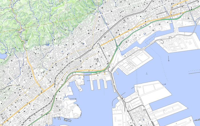 兵庫県の県庁所在地 神戸市中心部の地図だよ。神戸の中心街が山と海の間にあるのがよく分かるね。