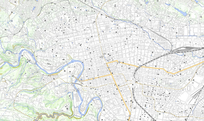 宮城県の県庁所在地 仙台市中心部の地図だよ。蛇行する広瀬川や仙台駅が見えてるね。
