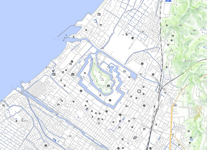 天守が国宝指定されてる「彦根城」だね。地図左側の水域は、琵琶湖だよ。
